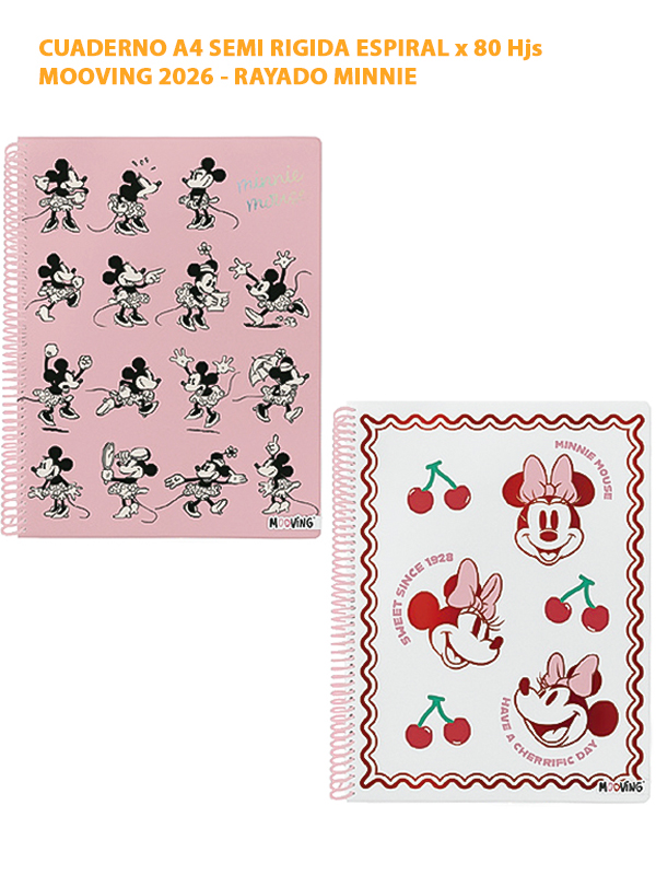 CUADERNO A4 SEMI RIGIDA ESPIRAL x 80 Hjs MOOVING 2026 - RAYADO MINNIE