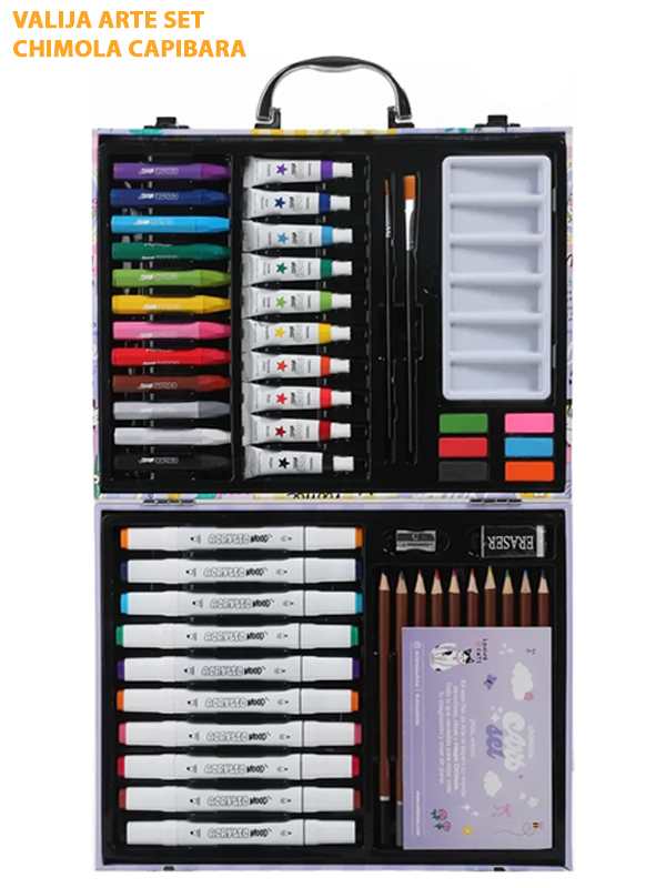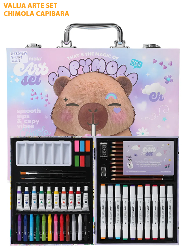 Un set creativo súper completo, presentado en una valija temática Capibara, ideal para chicos que aman dibujar, pintar y crear sin límites. Todos los materiales vienen perfectamente organizados para usar en casa, la escuela o llevar a cualquier lado.