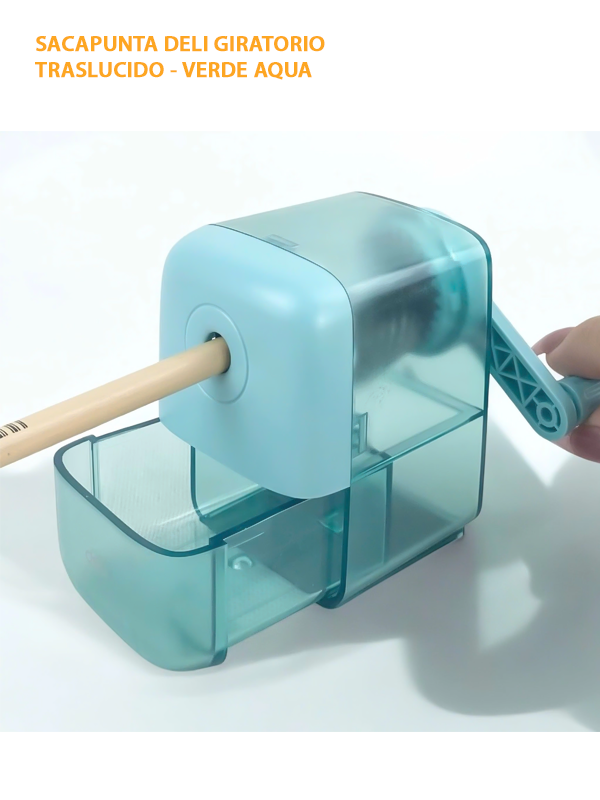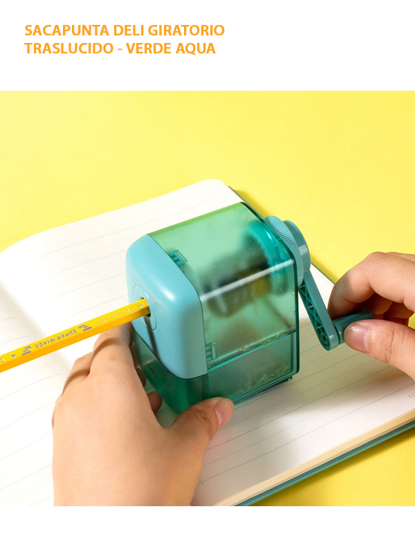 El sacapuntas Deli giratorio combina resistencia, calidad y un diseño atractivo. Su cuerpo transparente permite ver el giro del mecanismo interno, haciendo del afilado una experiencia visual y entretenida.