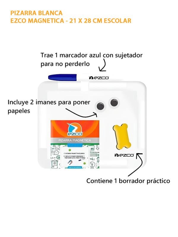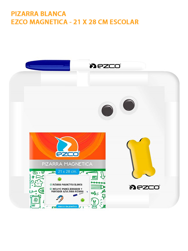 La Pizarra Blanca Magnética EZCO combina practicidad y funcionalidad en un formato compacto perfecto para el uso escolar, en casa o en la oficina. Su superficie blanca y lisa permite escribir con marcador y borrar fácilmente, manteniendo siempre una apariencia limpia y lista para volver a usar.