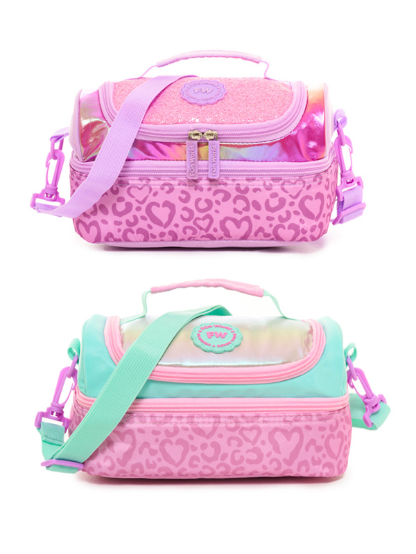 Lunchera chic Confeccionada en tela glitter y holográfica, combina brillo y estilo en un diseño funcional y moderno. Dimensiones: 24x14,5x13,5 cm. Compartimento superior con apertura frontal. Compartimento secundario con apertura 180°. Correa corta de mano. Correa de hombro ajustable y desmontable. Interior impermeable y aislante.