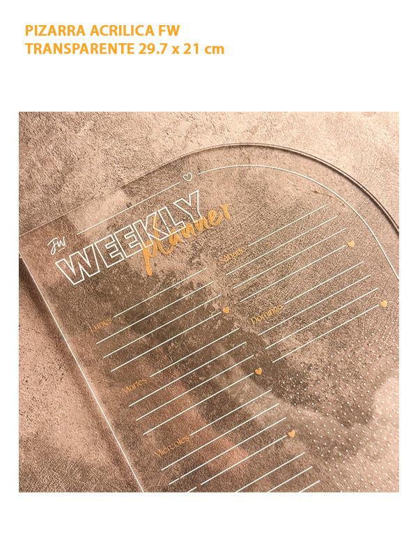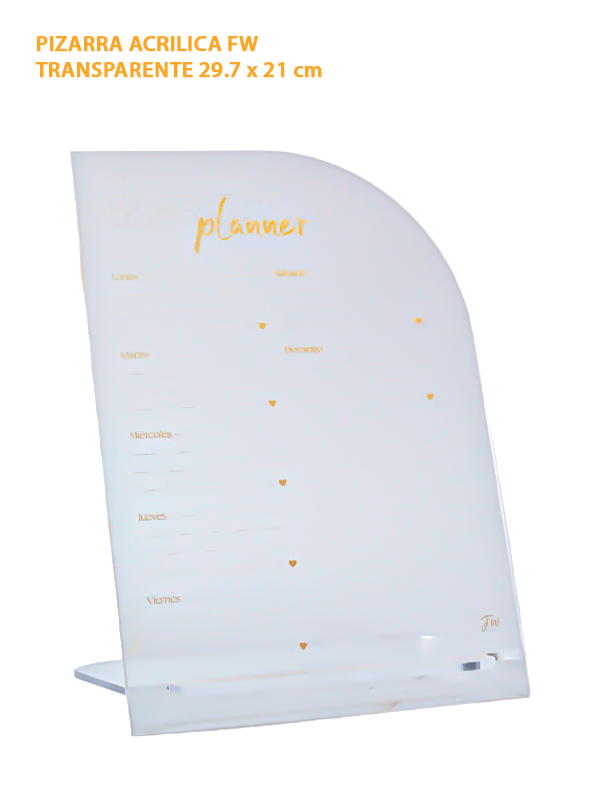 Organizá tu semana de manera práctica y elegante con esta pizarra acrílica FW. Su diseño incluye un planner semanal y un espacio para notas, ideal para recordatorios, tareas y objetivos. Gracias a su pie desmontable, podés colocarla en tu escritorio o apoyarla donde más te guste.