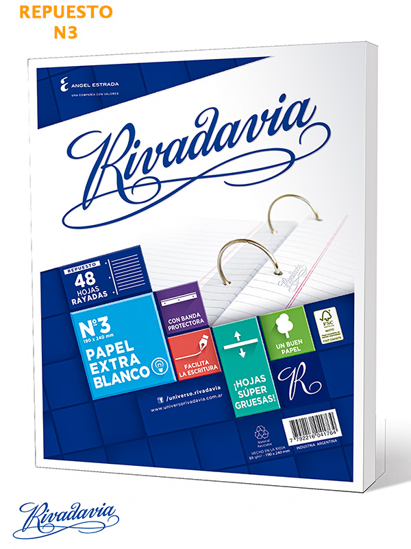 REPUESTO ESCOLAR N.3 RIVADAVIA CUADRICULADO X 48 HOJAS EXTRA BLANCO