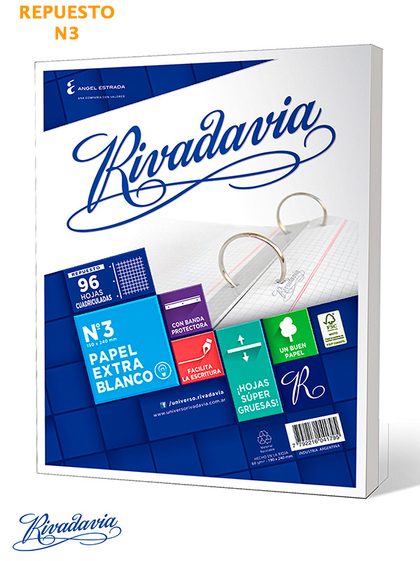 REPUESTO ESCOLAR N.3 RIVADAVIA CUADRICULADO X 96 HOJAS MATE