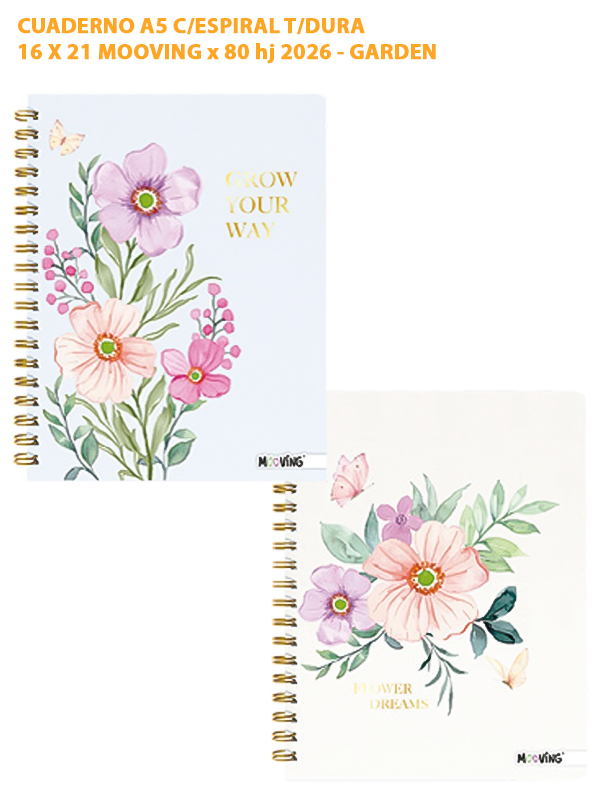 CUADERNO A5 C/ESPIRAL T/DURA 16 X 21 MOOVING x 80 hj 2026 - GARDEN