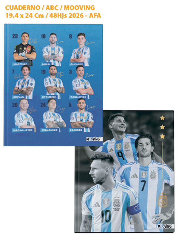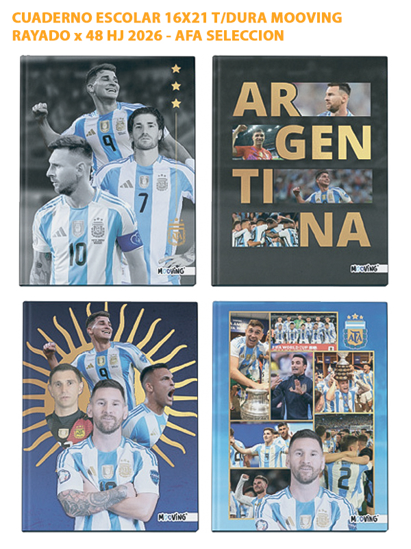CUADERNO ESCOLAR 16X21 T/DURA MOOVING RAYADO x 48 HJ 2026 - AFA SELECCION