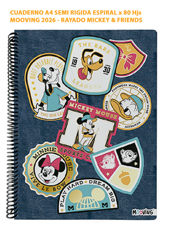 CUADERNO A4 SEMI RIGIDA ESPIRAL x 80 Hjs MOOVING 2026 - RAYADO MICKEY & FRIENDS