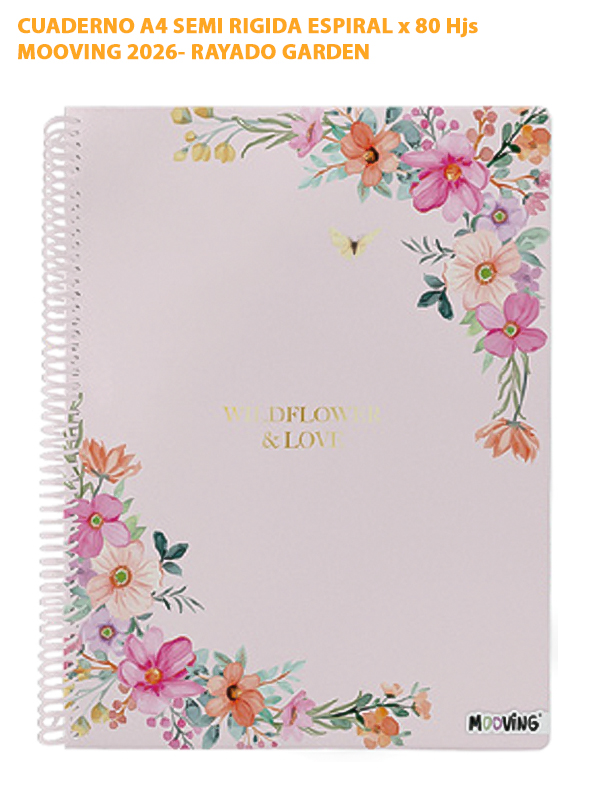 CUADERNO A4 SEMI RIGIDA ESPIRAL x 80 Hjs MOOVING 2026- RAYADO GARDEN