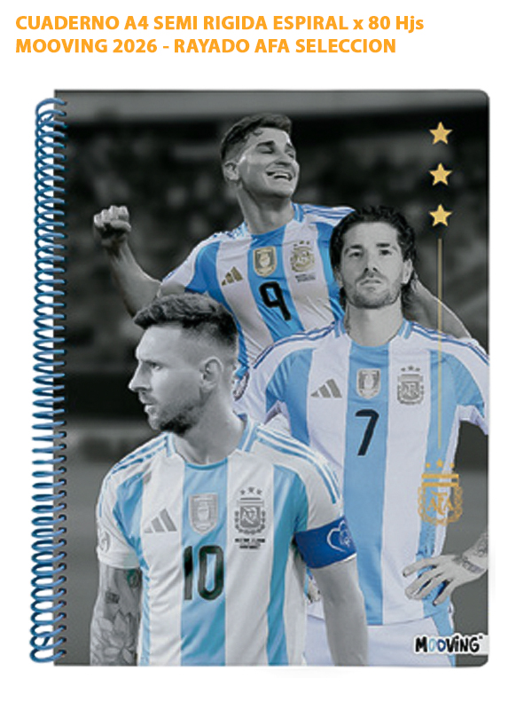 CUADERNO A4 SEMI RIGIDA ESPIRAL x 80 Hjs MOOVING 2026 - RAYADO AFA SELECCION